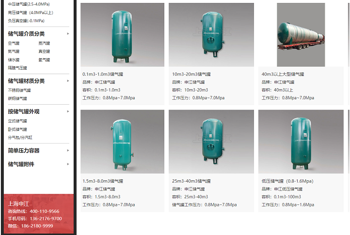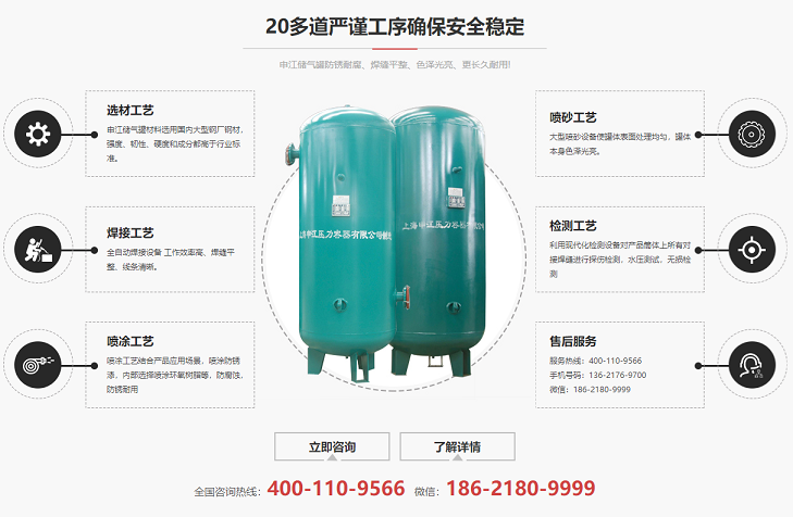 申江能夠生產(chǎn)0.1m3~100m3 共200多個規(guī)格的系列儲氣罐,除此之外,按用戶需求(來圖來樣)承接其他各種D1、D2級(I、 II類)壓力容器設計、制造。公司以“良好的產(chǎn)品質(zhì)量﹑專業(yè)的售前售后服務”贏得廣大用戶認可。