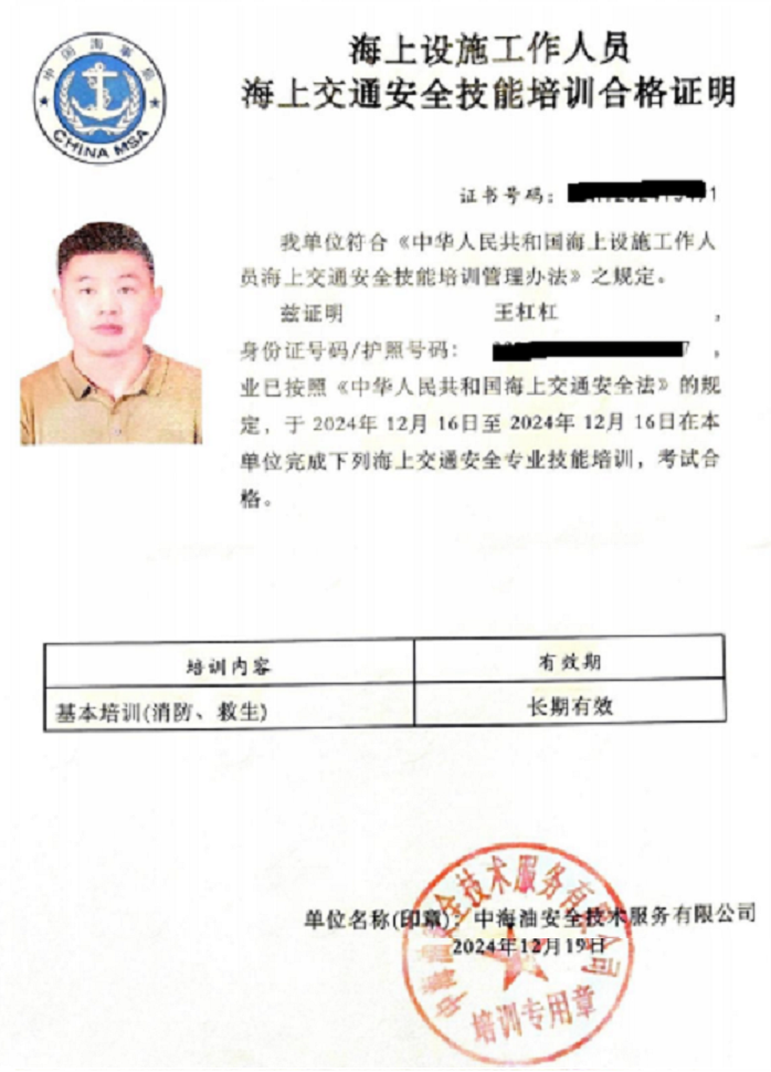 一、中國(guó)海洋石油集團(tuán)安全技術(shù)公司頒發(fā)的海上設(shè)施工作人員海上交通安全技能培訓(xùn)合格證明