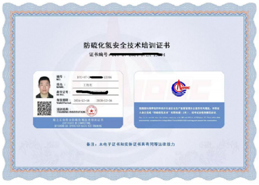 二、中國(guó)海洋石油集團(tuán)防硫化氫安全技術(shù)培訓(xùn)證書