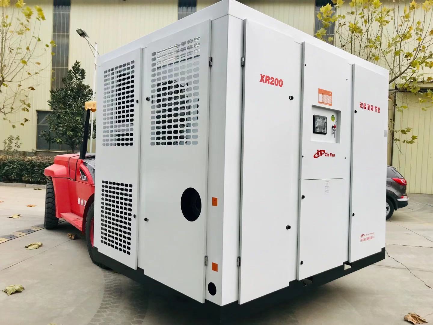 信然XR200大型永磁變頻螺桿空壓機(jī),10噸叉車剛剛好裝車發(fā)貨。信然永磁變頻兩級(jí)壓縮空壓機(jī):節(jié)能、高效、雙級(jí)、永磁變頻調(diào)速控制系統(tǒng)等功能。信然集團(tuán)(中國)工廠是大型空壓機(jī)、鼓風(fēng)機(jī)、真空泵、水井鉆機(jī)、制氮機(jī)、柴油空壓機(jī)、空分設(shè)備等產(chǎn)品制造企業(yè),產(chǎn)品有:空氣壓縮機(jī),螺桿空壓機(jī)。上海信然壓縮機(jī)有限公司是空壓機(jī)生產(chǎn)廠家,專業(yè)從事空壓機(jī)的設(shè)計(jì)、研究、生產(chǎn)。信然公司已為當(dāng)時(shí)空壓機(jī)的設(shè)計(jì)和生產(chǎn)制定了,同時(shí),信然空壓機(jī)已被高質(zhì)量壓縮空氣污染物 清除設(shè)備,其產(chǎn)品包括:中高壓活塞式空壓機(jī)、固定螺桿式空壓機(jī)、移動(dòng)螺桿式空壓機(jī)、螺桿活塞復(fù)合式壓縮機(jī)、無油螺桿空壓機(jī)、防爆空壓機(jī)、離心式壓縮機(jī)、潛孔鉆車、空氣干燥機(jī)、精密過濾器、儲(chǔ)氣罐、氣動(dòng)工具等,被廣泛運(yùn)用于各行各業(yè)。經(jīng)過良好的生產(chǎn)設(shè)施和生產(chǎn)技術(shù),使信然公司成為能提供多機(jī)組全系列的壓縮機(jī)生產(chǎn)公司。