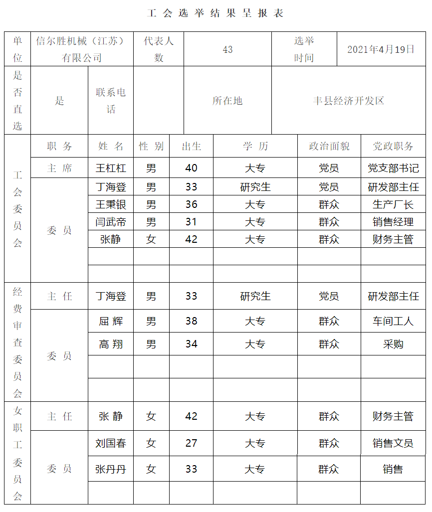 一是我們向開(kāi)發(fā)區(qū)總工會(huì)遞交了成立工會(huì)組織的申請(qǐng)報(bào)告,開(kāi)發(fā)區(qū)總工會(huì)同意我單位成立工會(huì)委員會(huì),并要求我們召開(kāi)工會(huì)成立大會(huì),民主選舉工會(huì)三個(gè)委員會(huì)。二是成立了由5人組成的籌建工會(huì)領(lǐng)導(dǎo)小組,積極對(duì)接工會(huì)籌備工作。三是按照《中國(guó)工會(huì)章程》的有關(guān)規(guī)定,公司遵循員工自愿入會(huì)的原則,在廣泛宣傳的基礎(chǔ)上,認(rèn)真做好發(fā)展職工加入工會(huì)組織工作,公司現(xiàn)有103名職工已加入工會(huì)組織,入會(huì)率已達(dá)100%。四是經(jīng)過(guò)民主推薦和協(xié)商確定了工會(huì)委員會(huì)、經(jīng)費(fèi)審查委員會(huì)和女職工委員會(huì)委員候選人。五是認(rèn)真做好大會(huì)各項(xiàng)籌備工作,現(xiàn)在大會(huì)各項(xiàng)工作準(zhǔn)備就緒,可以召開(kāi)信爾勝機(jī)械(江蘇)有限公司工會(huì)成立大會(huì)。