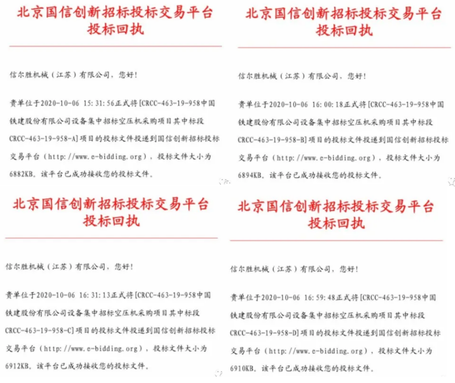 信然空壓機(jī)江蘇工廠(chǎng)投標(biāo)中國(guó)鐵建股份有限公司設(shè)備集中招標(biāo)空壓機(jī)項(xiàng)目所有4個(gè)標(biāo)段。分別把信然空壓機(jī)相關(guān)資質(zhì)文件投遞到國(guó)信創(chuàng)新招標(biāo)投標(biāo)交易平臺(tái)。投標(biāo)編號(hào):CRCC-463-19-958-A;投標(biāo)編號(hào):CRCC-463-19-958-B;投標(biāo)編號(hào):CRCC-463-19-958-C;投標(biāo)編號(hào):CRCC-463-19-958-D;信然集團(tuán)作為央企、國(guó)企、上市企業(yè)等設(shè)備供應(yīng)商,已經(jīng)有近16年的歷史,為各大國(guó)企、央企、上市、外資、民營(yíng)等企業(yè)提供質(zhì)量穩(wěn)定、價(jià)格實(shí)惠、服務(wù)周到的壓縮機(jī)、鼓風(fēng)機(jī)、真空泵、制氮機(jī)、空分設(shè)備、鉆機(jī)鉆車(chē)等產(chǎn)品。