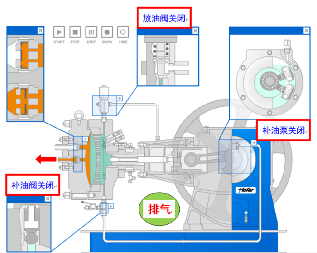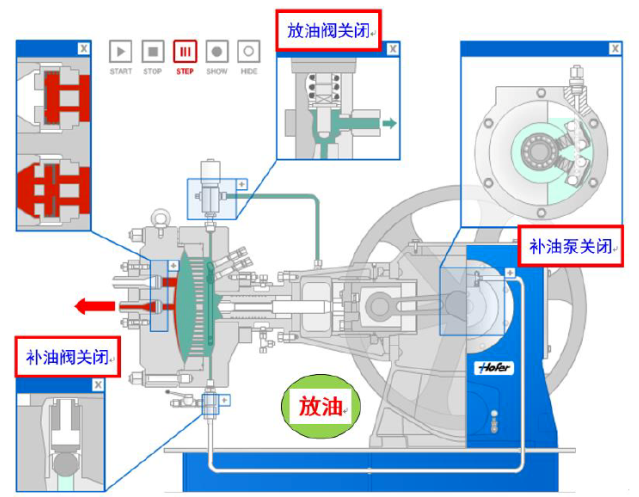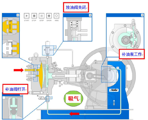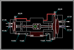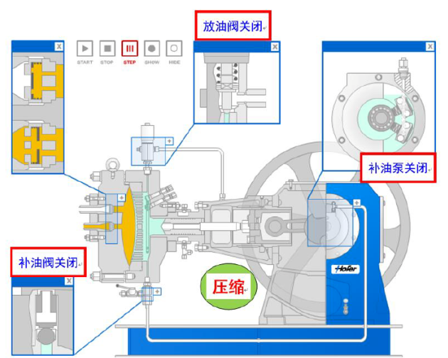 在壓縮機的每個循環(huán)中,液壓油推動膜片壓向氣盤。如果泄露的潤滑油得不到及時的補充,潤滑油容積將不但下降,膜片會不能貼近氣盤,導(dǎo)致余隙容積增大,影響壓縮機的性能。因此正確的補償油路系統(tǒng)是保障壓縮機性能的一個關(guān)鍵。