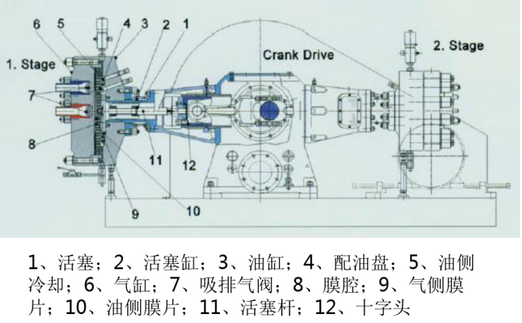 液壓活塞(活塞桿)安裝到十字頭上。活塞通過活塞環(huán)密封并在液壓缸中往復(fù)運動。活塞的每次運動產(chǎn)生一個固定容積的潤滑油量,并由此帶動膜片往復(fù)運動。潤滑油作用在膜片上,因此實際上是膜片壓縮氣體。