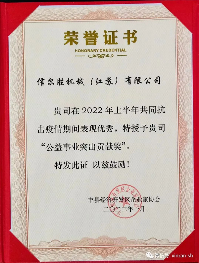 2023年1月12日下午,企業(yè)家協(xié)會舉辦了“2022年公益事業(yè)突出貢獻(xiàn)獎證書頒發(fā)儀式”。信爾勝機(jī)械(江蘇)有限公司在共同抗擊疫情期間表現(xiàn)優(yōu)秀,特授予“公益事業(yè)突出貢獻(xiàn)獎”