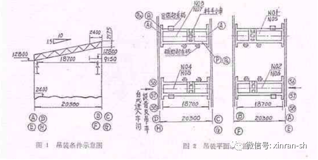 吊車軌道頂面標高為9.15米,地坪標高約為2.4米(接近車問樓板2.4米標高),廠房內 55~58 柱線為吊裝的作業(yè)面。見圖 1 及圖 2
