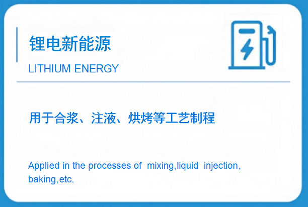 一、鋰電新能源LITHIUM ENERGY用于合漿、注液、烘烤等工藝制程Applied in the processes of mixing,liquid injection, baking,etc.
