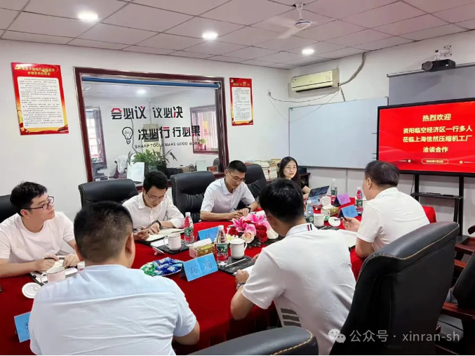 7月2日,四川資陽市臨空經(jīng)濟(jì)區(qū)商合局局長王超、商務(wù)經(jīng)合局招商科長趙洋、資陽臨空園區(qū)管理有限公司產(chǎn)業(yè)總監(jiān)曹曉玉、資陽臨空園區(qū)管理有限公司招商總監(jiān)楊雪智等人蒞臨信然壓縮機(jī)江蘇工廠。上海信然壓縮機(jī)有限公司董事長卜慶團(tuán)、信然壓縮機(jī)江蘇工廠生產(chǎn)廠長高翔、信然壓縮機(jī)市場拓展部經(jīng)理龔克禮、信然壓縮機(jī)辦公室主任程焱等熱情接待。