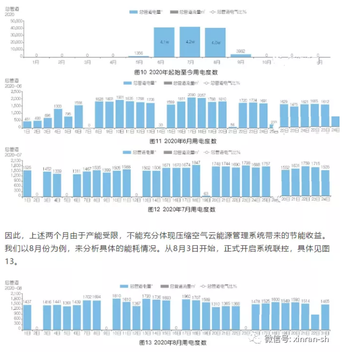 因此,上述兩個月由于產(chǎn)能受限,不能充分體現(xiàn)壓縮空氣云能源管理系統(tǒng)帶來的節(jié)能收益。我們以8月份為例,來分析具體的能耗情況。從8月3日開始,正式開啟系統(tǒng)聯(lián)控,具體見圖13。